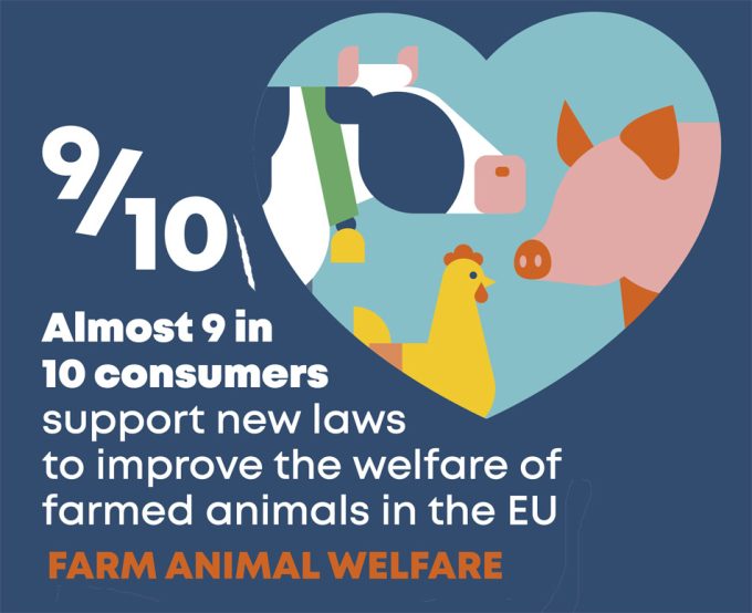 Según los resultados de una nueva investigación de BEUC (Organización Europea de Consumidores), los consumidores apoyan la legislación para mejorar el bienestar de los animales de granja, quieren saber más sobre la crianza de estos animales, que tengan más espacio vital, que se prohíban los sistemas de granjas y las mutilaciones, que se ponga en marcha un etiquetado con plenas garantías de bienestar animal, etc.