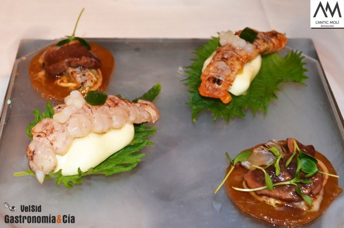 Pero vamos a por los platos, los 18 bocados con galera que Vicent Guimerà ha creado para exaltar a la Squilla mantis, que orgullosa tiene que estar la especie de haber caído en sus manos. Tened en cuenta que esta época es la mejor para consumir galera, así que además de recomendaros que visitéis L’Antic Molí, id a la pescadería para disfrutar de este crustáceo en casa.