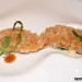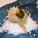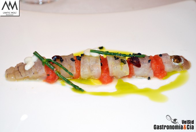 También con un concepto oriental tomamos el siguiente bocado de galera dedicado a la Tinença de Benifassà, un Nem la galera con cabra hispánica y frutos secos, nos hubiera encantado repetir. La Galera Peñiscolana es el Tartar de galera y caracoles de mar (cañaíllas) con tomate, cebolla y caviar de mar. Estos caracoles son muy típicos en los aperitivos del Mediterráneo, pero rellenos de galera sólo se pueden tomar en L’Antic Molí, y merece la pena.