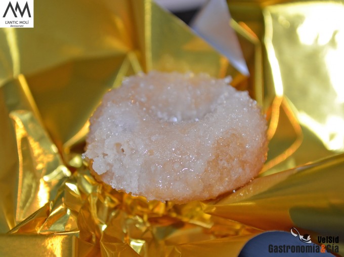 El último plato salado es el de la Galera Falduda, es la Royal de galera con aceite de oliva milenario de la finca de l’Arion, en Ulldecona. Exquisito su sabor, y la textura muy lograda, para lo que se añade un poco de foie y panceta. Se acompaña de un salteado de shiitake y aceite milenario.