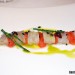 La galera que nos lleva a Sant Carles de la Ràpita se llama Burbujas de aceite de galera con langostinos al soplete y verduras, una de nuestras formas preferidas de comer la galera es sopleteándola, y en este plato, además la disfrutamos con variedad de verduras cada una cocinada en su punto.