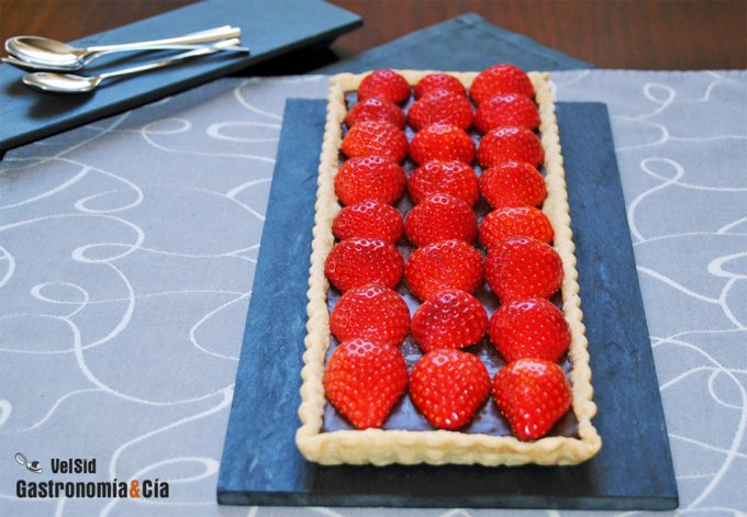 1 base de masa quebrada sin huevo, 180 gramos de chocolate al 70%, 180 gramos de nata (30-35% M.G.), c/n de fresas.