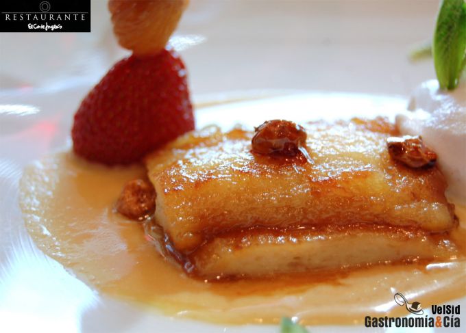 El postre que degustamos en esta ocasión fue la Torrija de horchata con helado de leche merengada y praliné de chufas, y qué decir, una torrija que se convertía en una crema en el paladar, plancheada con mantequilla antes de servirla, ofrecía sabores propios de la chufa y de frutos secos. Fue imposible dejar rastro del postre en el plato.