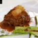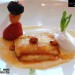 El plato principal de pescado fue la Merluza asada con pisto y jamón, un plato muy puro en sabores. El pisto totalmente integrado en la carne del pescado respeta el equilibrio de la fusión, la merluza, con una cocción correcta, resultaba muy jugosa, posada sobre una rodaja cremosa de berenjena y coronada con las verduritas impregnadas del tomate con el punto de acidez muy controlado. Un muy buen plato para los amantes de los sabores tradicionales.