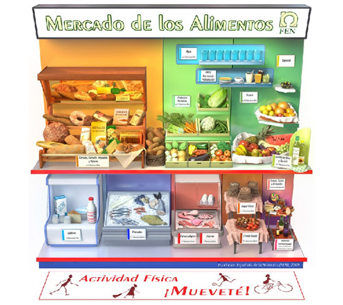 La Fundación Española de Nutrición (FEN) ha presentado el Mercado de los Alimentos, se trata de una nueva guía alimentaria que pretende acercar a la población hacia un mayor conocimiento de los hábitos saludables y de cómo debe ser una dieta variada y equilibrada. Es una alternativa virtual a la Pirámide de los Alimentos, de la que esperamos que no tarden en proporcionarla en papel para disponer en cualquier momento y en cualquier lugar de esta guía.