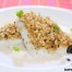 Sirve un cucharón de ajoblanco de nueces de Brasil y coloca en el centro del plato la merluza y sobre ella los espárragos verdes. Reparte por el plato un poco de cebollino picado, una nuez de Brasil laminada y unas gotas de vinagreta de lavanda. El toque rojo es opcional, puedes ponerle pimentón, shichimi u otra especia para darle color. ¡Buen provecho!