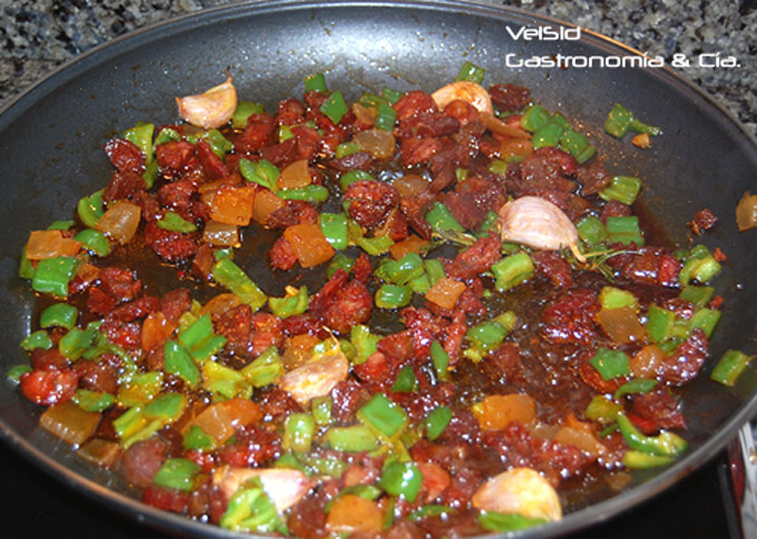 Lava y corta en brunoise los pimientos verdes, trocea también el chorizo y la panceta. Pon un buen chorro de aceite en una amplia paellera y sofríe los ajos majados (con un golpe) a fuego medio.