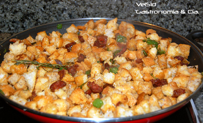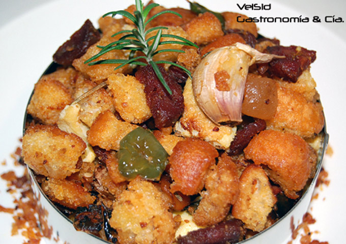 Hola! yo he preparado este plato, y me he buscado toda la información posible para elaborarlo puesto que no tenía ni idea y he podido comprobar en tu plato que le falta añadirle el agua, porque de esta manera no te quedan » picatostes» osea a cuadraditos.