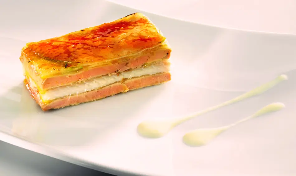 Es importante prensar y dejar reposar el milhojas durante al menos tres horas, ya que de lo contrario quedaría voluminoso y blando. Tras el reposo, desmoldar, cortar en 16 raciones y guardar cada una de ellas envuelta en film hasta el momento de servir. En ese momento, caramelizar con azúcar evitando que adquiera demasiado color, pues le daría un sabor amargo. Salsear el plato con el puré de cebolleta.