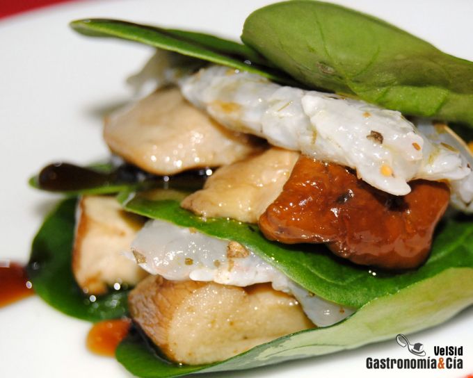 Dispón en los platos de servicio una cama con dos o tres hojas de espinacas, sobre ellas coloca una capa de boletus, a continuación un langostino extendido, sazona con unas escamas de sal y vuelve a colocar unas hojas de espinacas frescas, boletus y langostino. Termina este Milhojas de espinacas, boletus y langostinos con unas hojas de espinacas aderezadas con un hilo de reducción de balsámico de Módena y acompaña con una cucharadita de coulis de pimiento del piquillo. ¡Buen provecho!
