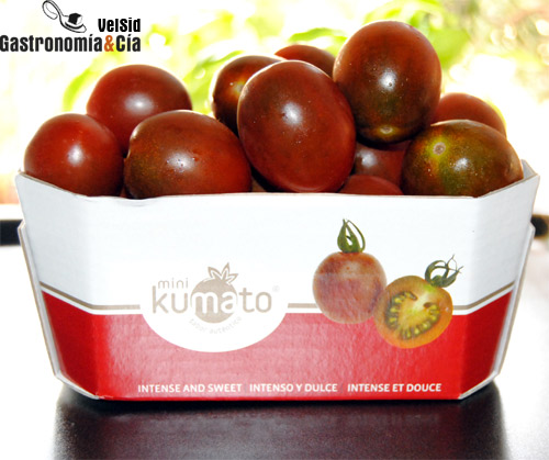 Una de las variedades de tomates mini que ya podemos encontrar en nuestro mercado son los Mini Kumato®, unos tomates cuyas características ya os comentamos en el post Tomate kumato, es dulce con un ligero toque ácido, aromático, terso y con una piel de color rojo y verde oscuro, y un poco dura para nuestro gusto. El kumato es un tomate obtenido por Syngenta con la técnica de mejora tradicional, cultivado principalmente en Murcia y Andalucía si hablamos de España.
