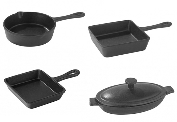 Sartenes mini de hierro y esmalte interior para servir la comida ya preparada, aunque también son aptas para cocinar. Este tipo de vajilla mini para uso individual es tendencia en hostelería, y también está disponible para la cocina doméstica.
