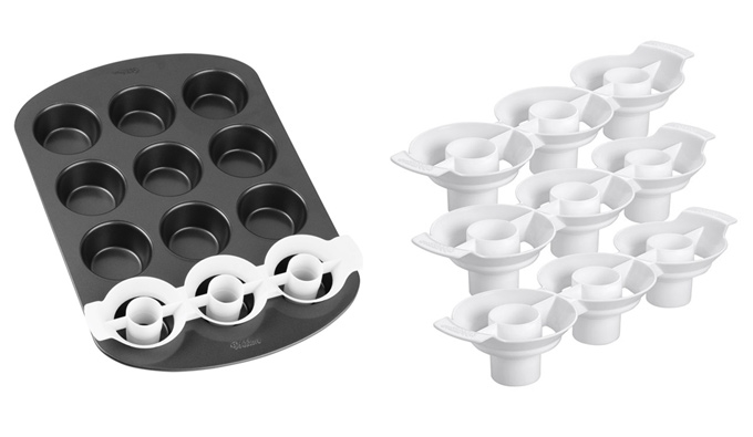 Wilton ha diseñado el molde accesorio para hacer cupcakes de dos colores que se ajusta perfectamente a su molde para cupcakes de 12 cavidades (pero seguramente también será apto para utilizarlo en moldes de otras marcas de medidas similares), de hecho, una opción de compra de dicho accesorio es acompañado del molde clásico de Wilton, su precio es de 21’90 euros aquí.