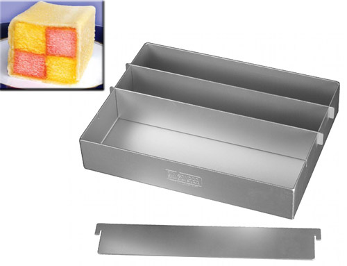 Este molde damero se puede adquirir en Caprichos de Cocina a un precio en torno a los 18 euros (consultar gastos de envío), es un molde rectangular de 20 x 15 x 4 cm que cuenta con tres separadores que nos permitirán separar las masas con distintos sabores y colores para después montar nuestra tarta bicolor o tricolor, según la creación que tengamos en mente elaborar.