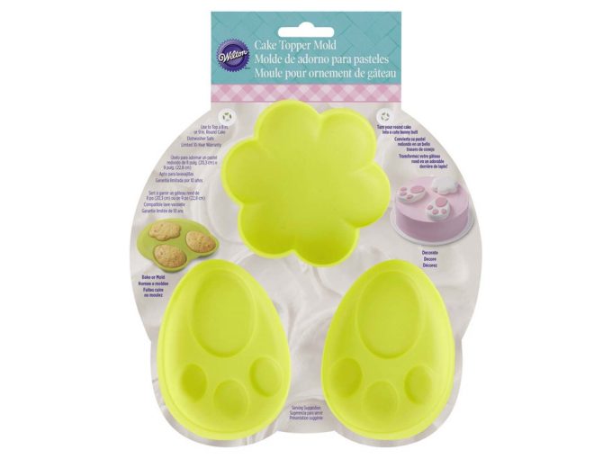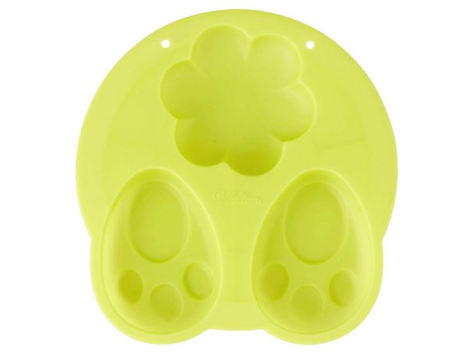 En la foto podéis ver el molde de adorno de conejito para pasteles de Wilton, es un molde de silicona que no es para hacer un pastel, si no para el adorno que se puede colocar sobre el bizcocho para hacer el pastel de Pascua. Como se puede apreciar, tiene tres cavidades, una para hacer la colita y las otras dos para hacer las dos patitas o huellas.