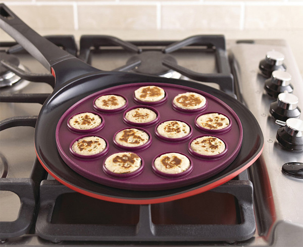 Hasta ahora conocíamos las sartenes o planchas que tienen los huecos en los que se vierte la masa para hacer las tortitas, también otro utensilio que consta de unos aros (como los de emplatar) que están unidos, tienen un asa y se utilizan poniéndolo en la sartén, la masa se vierte en su interior y se obtienen blinis del mismo tamaño.