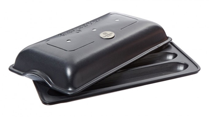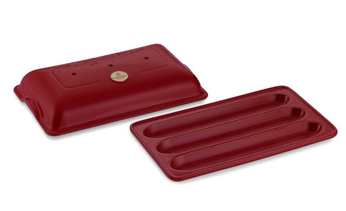 Pues bien, recientemente hemos conocido la versión de ‘horno para pan’ de la misma firma para hacer baguettes, es el que podéis ver en la imagen superior. También se trata de un utensilio fabricado con arcilla de Borgoña vitrificada compuesto por dos piezas, la base es como una bandeja que tiene el hueco para tres barras de pan.