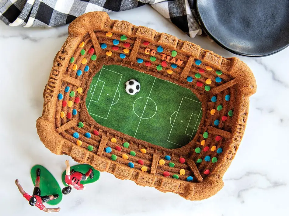 Si queréis hacer un pastel especial a una persona que sea muy aficionada al fútbol, este molde os va a encantar, porque vais a poder hacer su tarta de cumpleaños o de cualquier otra celebración con la forma de un estadio de fútbol. Claro, el molde os ayudará a hacer el bizcocho con la forma del estadio, luego será la creatividad de cada uno la que caracterice el escenario.