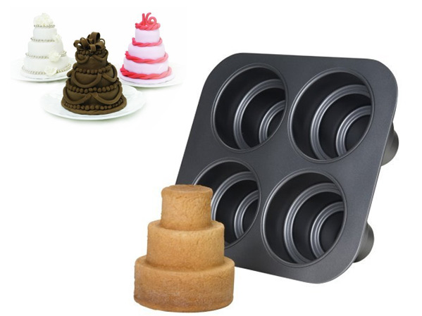 El molde que sí encontramos es el que ilustra este post, un molde con cuatro cavidades para hacer tartas y pasteles de tres pisos que después podremos decorar con una cobertura de chocolate, con fondant, con unas rosas de caramelo… no hay límite para la imaginación.