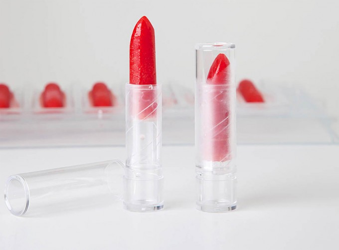 A continuación podéis ver un vídeo en el que se muestra cómo utilizar este molde para el relleno del pintalabios de degustación. El molde 3D Lipstick se compone de dos piezas que se unen, formando los cilindros de una barra de labios. Entonces se dispensa el relleno.