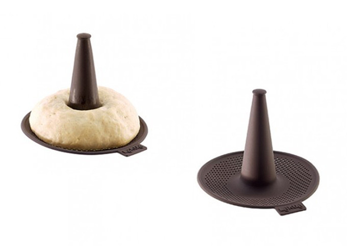 Como podéis apreciar en la foto, la masa de pan se coloca sobre el molde que se compone de una base circular y un cono en el centro que ayuda a mantener el agujero, y este molde se puede introducir en el agua para su primera cocción, y en el horno, para terminar de hacer el bagel. El molde se llama sencillamente Bagel, y la firma española de utensilios de silicona lo comercializa en un pack de seis unidades a un precio de 19’90 euros, sólo en el color que veis en las imágenes.
