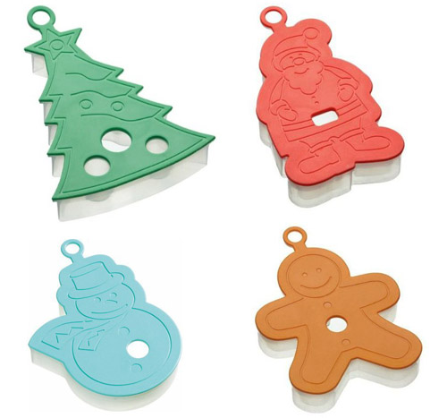 Continuamos viendo moldes de Navidad para repostería, hoy os mostramos algunos modelos de cortadores de galletas, como podéis ver en la imagen podemos elegir el árbol de Navidad, Papá Noel, el muñeco de jengibre (tradicional para hacer galletas de jengibre), el muñeco de nieve o el hada, aunque en esta misma línea de utensilios hay otros modelos con formas infantiles o motivos de distintas festividades.