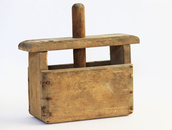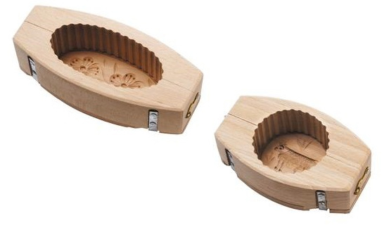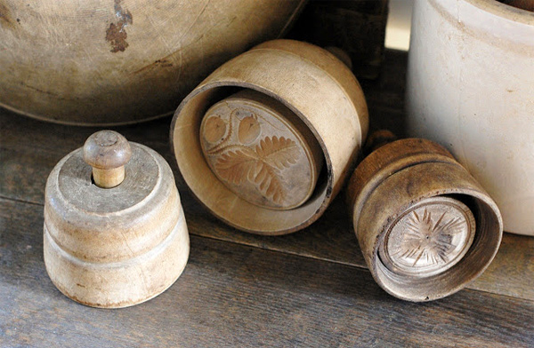Quizá en algún cajón o estantería de la cocina de vuestra madre o abuela habéis visto estos pequeños moldes de madera, son moldes para mantequilla que antiguamente se utilizaban para dar forma a la mantequilla hecha en casa. Hay distintos modelos y tamaños, desde los básicos con forma rectangular, a los que sirven para hacer porciones individuales, generalmente con grabados que hacen que la mantequilla moldeada tenga un dibujo en relieve.