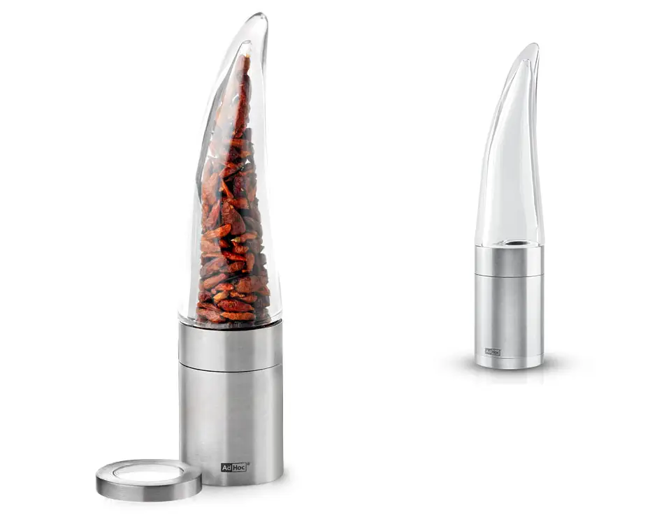 El molinillo se llama Pepe, Chilli cutter PEPE, y es de la compañía de diseño, desarrollo y producción alemana AdHoc. Está fabricado en acero inoxidable y acrílico, con unas medidas de 4’5 centímetros de diámetro y 20’5 centímetros de alto, y está diseñado para moler las guindillas secas, no las frescas.