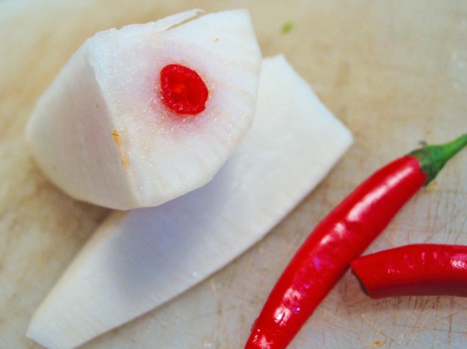 Sobre el daikon (Raphanus sativus) ya os hemos hablado, es un rábano alargado como una zanahoria o una chirivía, blanco y con un sabor picante. Aunque hace ya muchos años que se introdujo en nuestro país, encontrarlo fresco todavía no es fácil si no se acude a comercios especializados, pero también os hemos mostrado otras formas de presentación más accesibles, como el Daikon seco.
