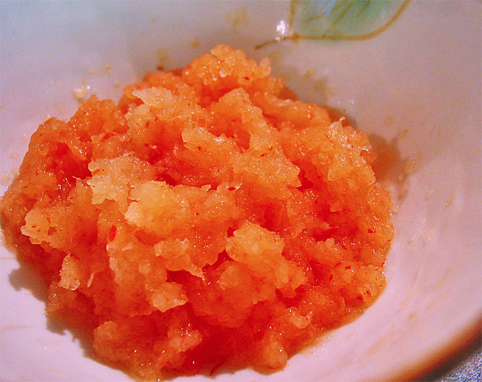 En este caso no hay que hablar de otro rábano japonés, ni de ningún ingrediente que no conozcamos ya, el Momiji Oroshi es una pasta que se elabora con el rábano Daikon y con chile o guindilla roja. Claro, en Japón utilizan su variedad de guindilla picante, pero se puede sustituir fácilmente por las guindillas largas rojas que cultivamos en nuestro país.
