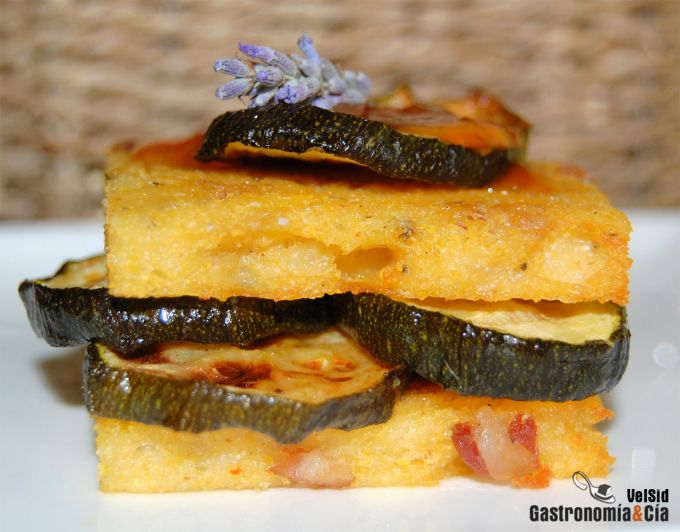 Hace un tiempo os hablamos de la polenta y de su versatilidad en la cocina. Hoy os traemos una receta elaborada con ella, el Montadito de polenta al horno con calabacín que está divino. Como podéis apreciar en las fotos, la polenta está hecha con ingredientes que le dan sabor como la panceta y las especias, y lo que no se ve pero que también hace que sea una delicia, es el queso parmesano rallado. Simplemente con esto ya es una delicia para tomar como si fuera una galleta salada, una focaccia o pan, sólo o acompañado, pero para completar la tapa, rellenamos la polenta con calabacines horneados y un poco de mermelada de tomate.