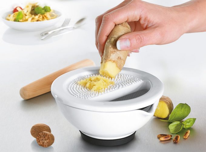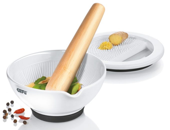 El caso es que nos ha gustado mucho el suribachi que podéis ver en las fotos, aunque no solo es un mortero, son dos utensilios en uno, a cuál más práctico. Se trata de un clásico mortero suribachi con un diseño sencillo y elegante, que se acompaña de un rallador de jengibre inspirado también en los utensilios de cocina japoneses, hablamos del oroshigane, también denominado oroshiki, y como os comentamos en este post, tiene algunas utilidades más.
