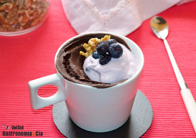 Introduce la taza en el microondas y programa 1 o 1’30 minutos a 800W. Finalizado el tiempo, retira la taza del microondas y deja que pierda algo de temperatura antes de comerlo.
