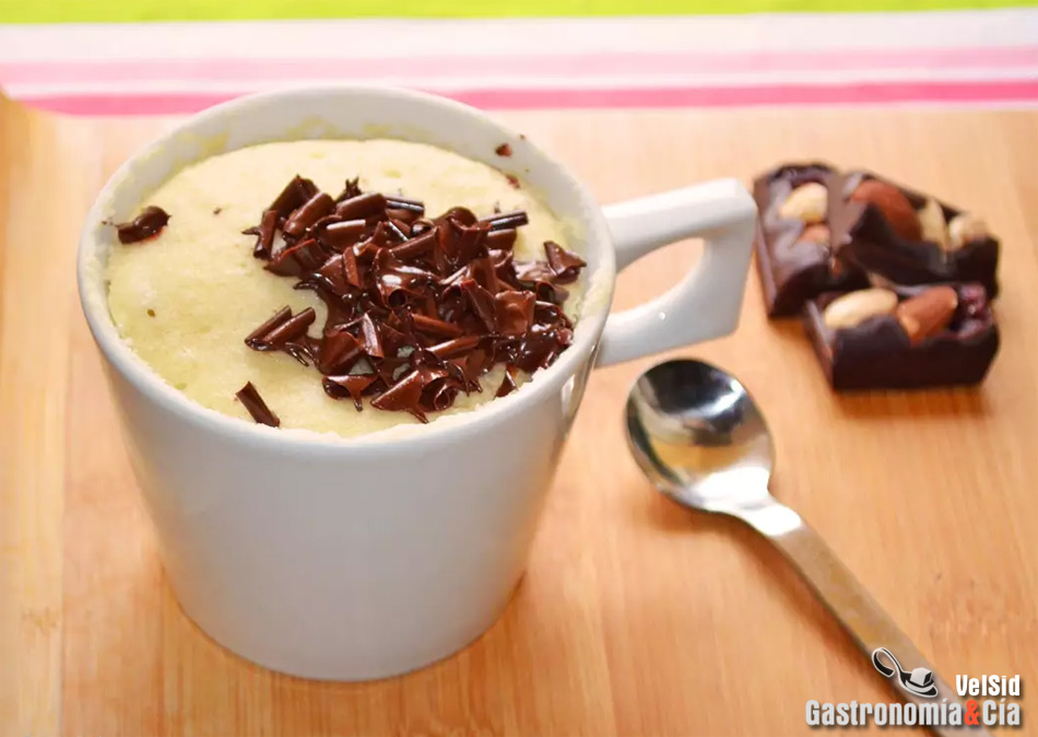 Introduce la taza en el microondas y programa entre 1’40 y 2 minutos, el tiempo puede variar según el microondas. Nosotros lo hemos hecho en dos microondas distintos y en cada uno precisamos el tiempo indicado. Cuando veas que el bizcocho ha subido y la superficie está brillante, puedes comprobar si está hecho, pero antes de abrir la puerta del microondas deja reposar un minuto.