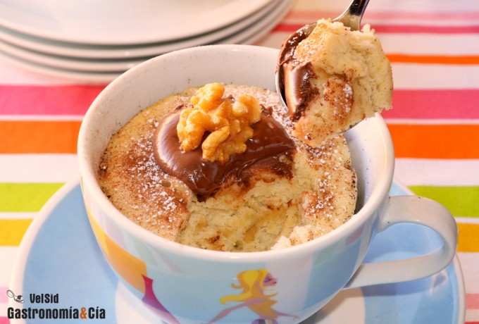 Debemos destacar que es un mug cake sin huevo, por lo que las personas que padecen intolerancia a este alimento podrán disfrutar también de este bizcocho. Lo hemos coronado con un poco de crema de cacao porque somos unos golosos, pero también se puede tomar sin la crema o introduciendo gotas de chocolate en la masa si se desea incluir chocolate. Probad el Mug cake de plátano con nueces que os gustará, además podréis aprovechar para gastar plátanos muy maduros.