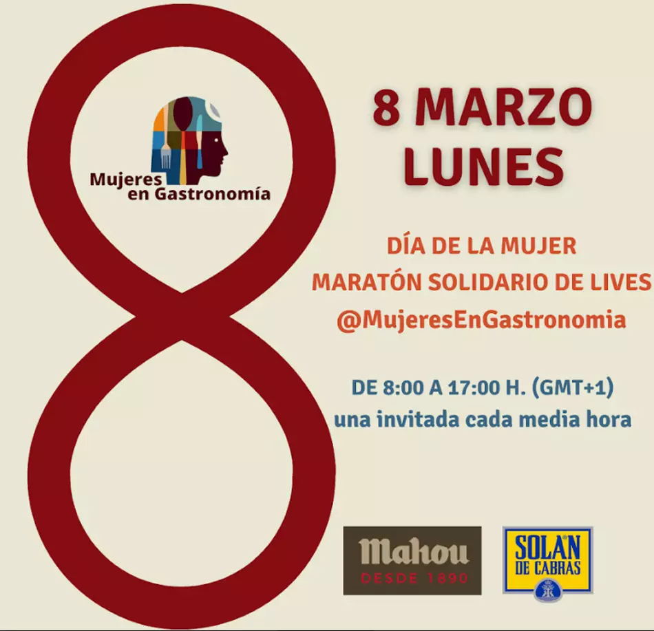 Uno de los actos que queremos destacar en el área de la gastronomía es el que organiza Mujeres en Gastronomía, que celebrará el Día de la Mujer con un Maratón Solidario de ‘Lives’, es decir, directos en redes sociales (Instagram), en los que participarán pasteleras, jefas de sala, chefs, productoras, empresarias, docentes… mujeres con talento de distintos ámbitos relacionados con la gastronomía.