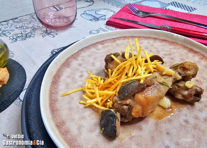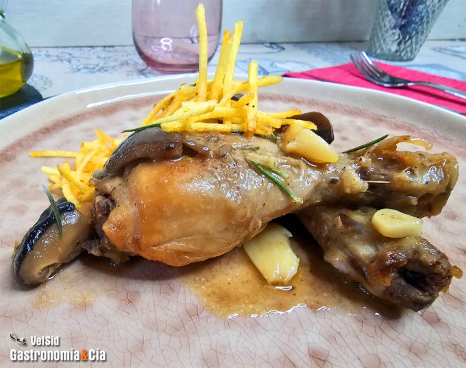 Sirve los muslos de pollo con setas al ajillo en los platos y riega con el jugo de la cocción. Puedes añadir unas patatas fritas paja para darle un toque de gracia o, por supuesto, hacer unas buenas patatas fritas caseras, no habrá nada mejor. El resto es comer y disfrutar. ¡Buena cocina y buen provecho!