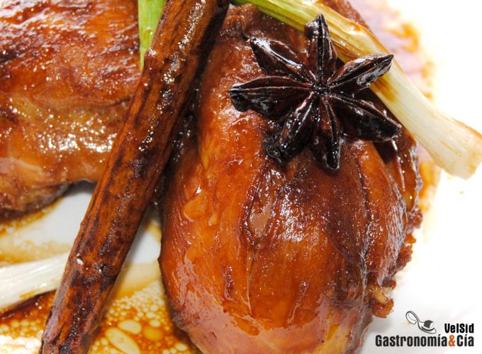 Como sucede normalmente en la cocina, hay algunas variantes de salsa roja o salsa maestra, pero principalmente los ingredientes que incluye son salsa de soja, vinagre o vino de arroz, anís estrellado, canela o cassia, clavos, pimienta de Sichuan, piel de cítricos, jengibre… A continuación veréis nuestra receta de muslos de pollo rojos, y recordad, que la salsa maestra nos permitirá después darle otros usos que enriquecerán nuevos guisos.