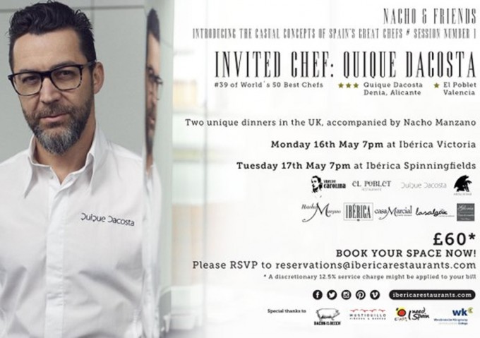 Pues bien, Quique Dacosta cocinará en Ibérica Restaurants con Nacho Manzano con motivo del primer encuentro Nacho & Friends, y lo hará dos días, el 16 de mayo en Ibérica Victoria (Londres) y el 17 de mayo en Ibérica Spinningfields (Manchester). A continuación os mostramos el menú que han preparado y que se podrá degustar por 60 £ (unos 76 euros, más un cargo del 12’5%). Hay que decir que para el encuentro de Manchester ya no quedan plazas.