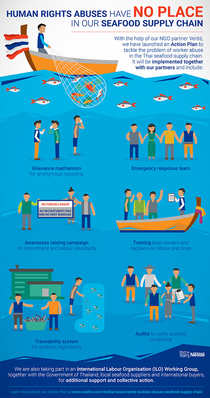 En su informe, Nesté explica que los trabajadores de la industria pesquera de Tailandia proceden de países del sudeste asiático, como por ejemplo Birmania o Camboya, se explica que se les cobra de forma ilegal una especie de impuesto para poder obtener un puesto de trabajo, pero una vez en el barco deben seguir pagando dinero por su puesto de trabajo, siendo el pago mayor que el dinero que puedan ganar. Nestlé se ha comprometido a publicar sus informes y a tomar medidas como la imposición de nuevas normas a los proveedores, así como auditorías externas realizadas a la cadena de suministro.