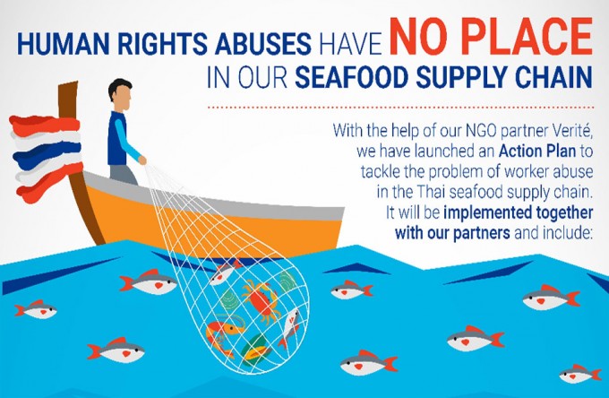 Bajo estas líneas podéis ver la infografía publicada por Nestlé en la que se muestra el plan de acción para abordar el problema del abuso laboral en la cadena de suministros de marisco y pescado de Tailandia. La campaña de sensibilización sobre las normas de contratación laboral, el asesoramiento a propietarios de embarcaciones y capitanes de barcos sobre las correctas prácticas laborales, la puesta en marcha de los sistemas de trazabilidad, etc.