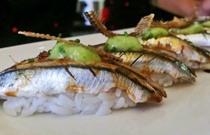 Volvemos a descubrir una receta del chef del restaurante Gyotaku, Cristo Hernández, que ejemplariza la cocina fusión, como ya vimos con su creación ‘Sándwich de toro con chutney de tomate canario’ en este post. Ilustrando estas líneas lo que vemos es su Nigiri de sardina, mojo verde y espina crujiente, otra versión para disfrutar del sushi con un toque canario como es el de la tradicional salsa de cilantro que seguro que todos conocéis, y habréis comido con las no menos tradicionales papas arrugás.