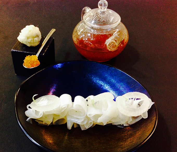 Servir el caldo de chipirón en tetera y en el cubo de madera la croqueta y la cuchara de huevas de pez volador.