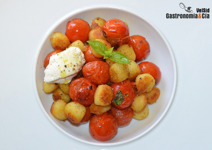 En alguna de nuestras últimas recetas de ñoquis o gnocchi ya os habíamos comentado que estábamos cocinando este ingrediente de forma distinta a la tradicional, que es cociéndolos en agua hirviendo. Ahora nos gusta saltear los ñoquis en la sartén dorándolos y consiguiendo que tengan una superficie tostada y crujiente, manteniendo el interior tierno. Hoy os explicamos cómo los hacemos con esta receta de Ñoquis a la sartén con tomates y ricotta.