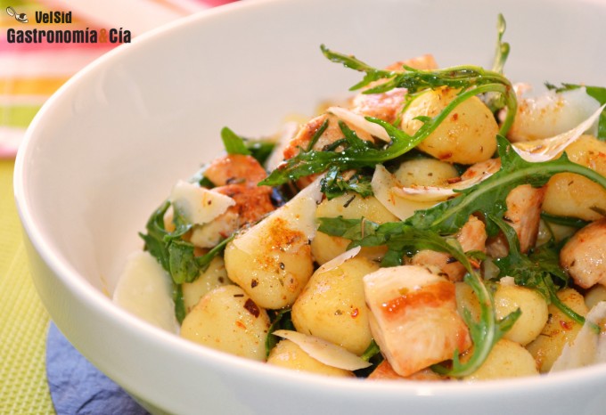 Una vez que el agua de la olla rompa a hervir, añade sal y a continuación los ñoquis. A medida que vayan saliendo a flote, retíralos con una espumadera bien escurridos, incorpóralos a la sartén con el pollo y la rúcula.