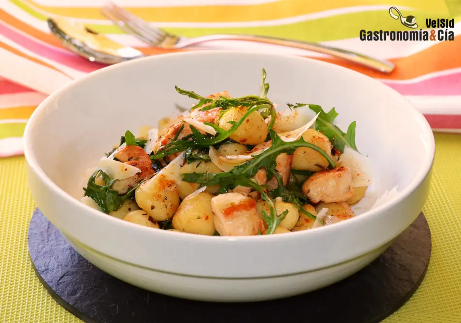 Una vez que el agua de la olla rompa a hervir, añade sal y a continuación los ñoquis. A medida que vayan saliendo a flote, retíralos con una espumadera bien escurridos, incorpóralos a la sartén con el pollo y la rúcula.