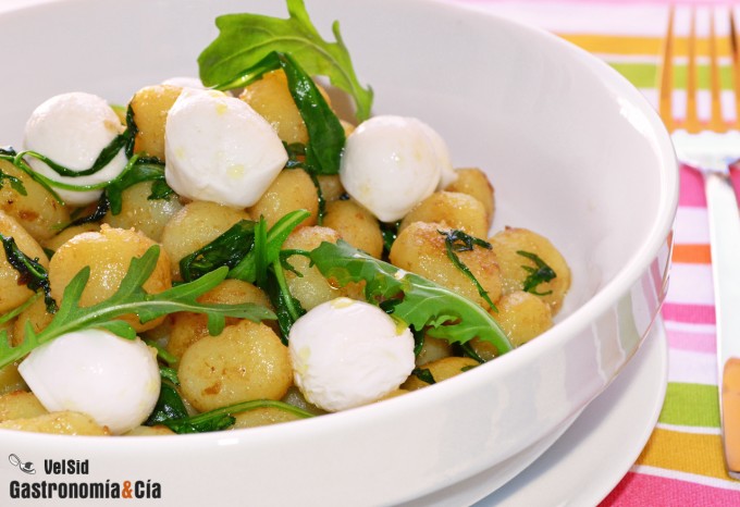 De todas formas, si os apetece disfrutar de este plato y no tenéis tiempo de preparar los ñoquis o gnocchi caseros, podéis comprarlos preparados, en pocos minutos los tendréis cocidos y también en muy poco tiempo prepararéis su aderezo de rúcula, anchoas y mozzarella. Un plato listo en 10 minutos. Tomad nota de la receta.
