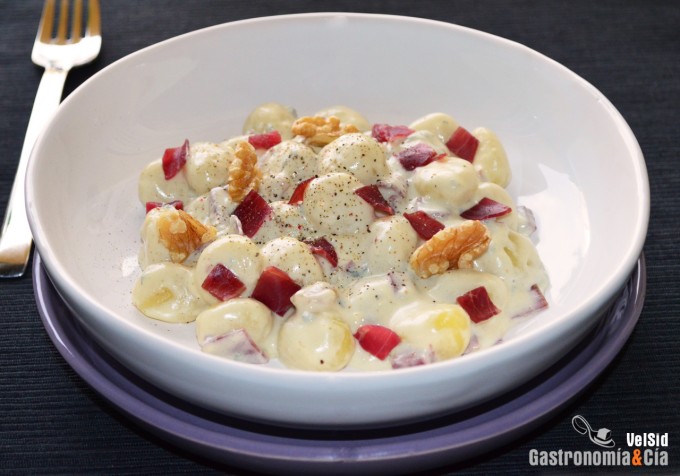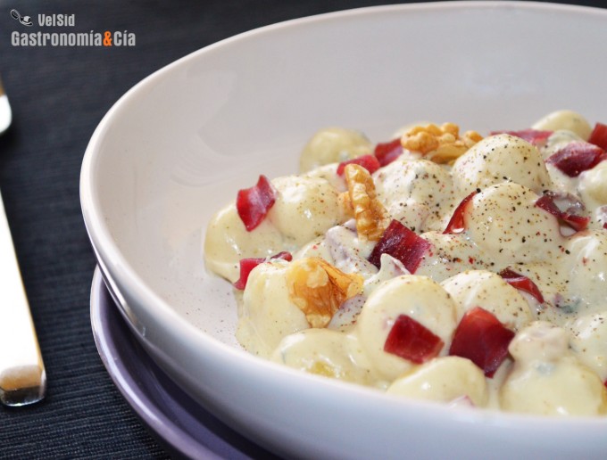 Si tenéis unos ñoquis para comer y queréis hacer una salsa rápida, sencilla y muy sabrosa, podéis probar esta con queso azul, cecina y nueces. Claro, es un plato ideal para quienes disfrutan de esta variedad de queso, se puede elegir el que más os guste. En caso de que el queso azul no sea de vuestro agrado no penséis que esta receta no es para vosotros, pues podéis sustituirlo por otro tipo de queso que funda bien para hacer una salsa.