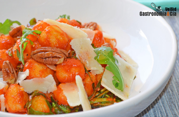 Sirve los ñoquis con salsa de tomate, aove y rúcula en los platos, reparte las nueces troceadas y el queso parmesano cortado en lascas con ayuda de un pelador de vegetales. Termina con una vuelta de molinillo de pimienta. ¡Buen provecho!