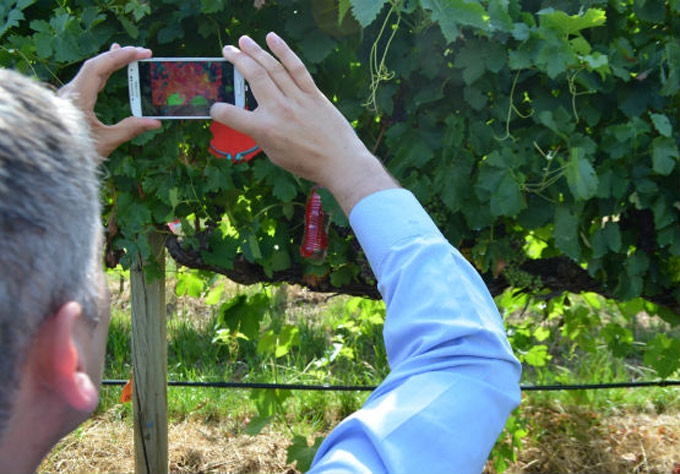 Por el contrario, un exceso de agua aumenta el crecimiento vegetativo, el número de racimos y la producción en general, pero se reduce la relación pulpa/hollejo, la uva pierde color, se retrasa la maduración y los vinos resultantes no son de la calidad esperada. El secreto está en el gestionar correctamente el riego y el estrés hídrico, de ese modo se podrá mejorar la calidad del vino sin que afecte a la rentabilidad de forma significativa. Esta nueva herramienta vitícola portátil está formada por una cámara térmica unida al smartphone, tras tomar las fotografías del viñedo, la app se encarga de analizar las imágenes y ofrecer datos sobre el estado hídrico de las vides.